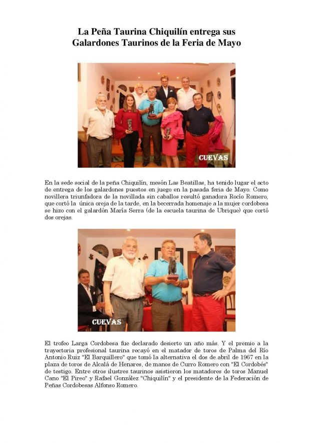 La Peña Taurina Chiquilín entrega sus Galardones Taurinos de la Feria de Mayo 2016, HemerotecaPor Claudia Starchevich11 junio, 2016 Informa José Luis Cuevas Flores