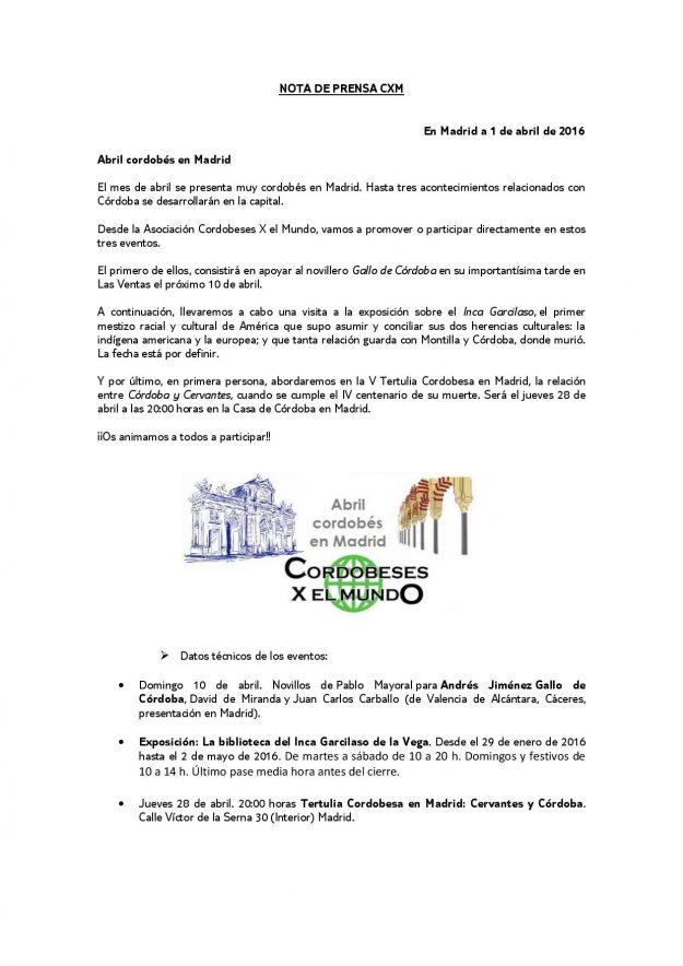 Abril cordobés en Madrid 2016, HemerotecaPor Claudia Starchevich8 abril, 2016 Informa Asoc. Cordobeses X el Mundo