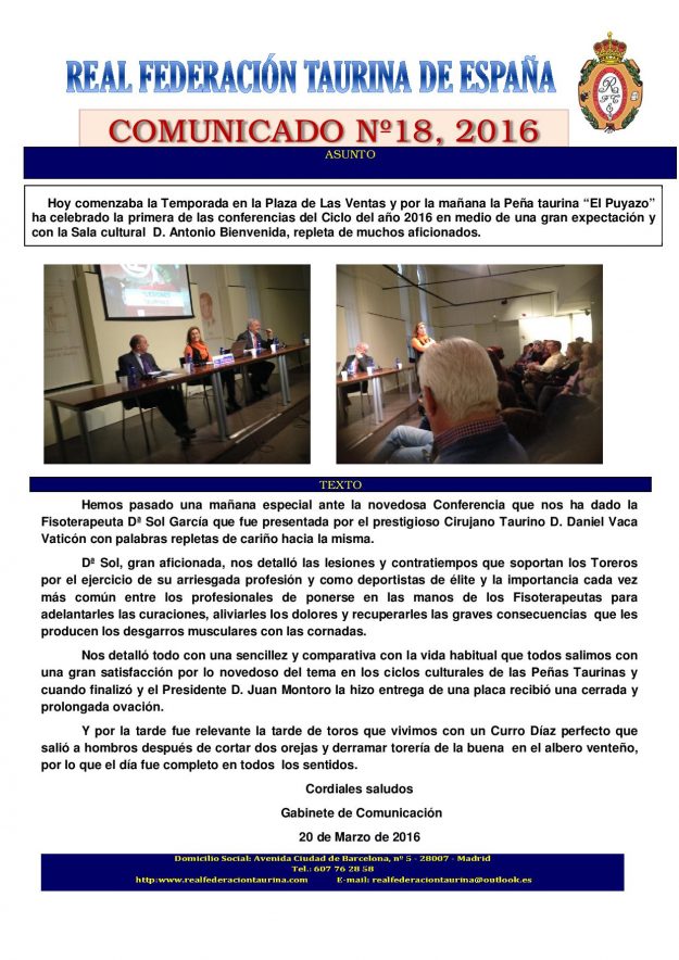 Conferencia Peña taurina `El Puyazo´ 2016, HemerotecaPor Claudia Starchevich21 marzo, 2016 Informa Real Federación Taurina de España