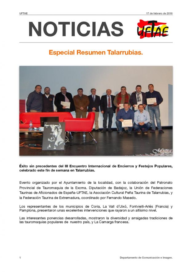 Resumen III Encuentro Encierros y Festejos Populares Talarrubias (1/3) 2016, HemerotecaPor Claudia Starchevich26 febrero, 2016 Informa Federación Taurina de Madrid