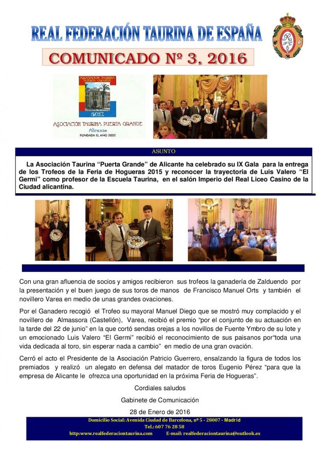 Acto celebrado en la Asociación Taurina Puerta Grande de Alicante 2016, HemerotecaPor Claudia Starchevich30 enero, 2016 Informa Real Federación Taurina de España