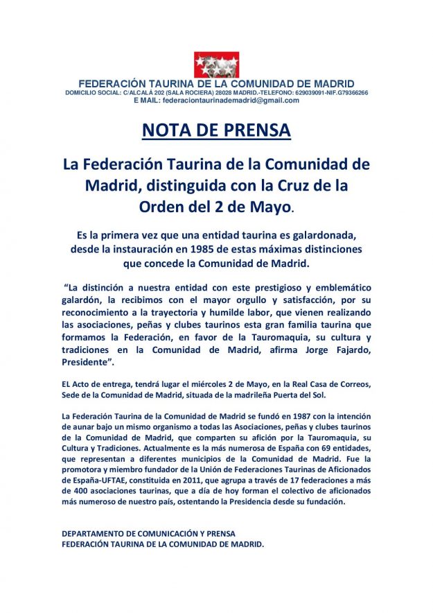 Federación Taurina de la Comunidad de Madrid recibió la Cruz de la Orden del 2 de Mayo