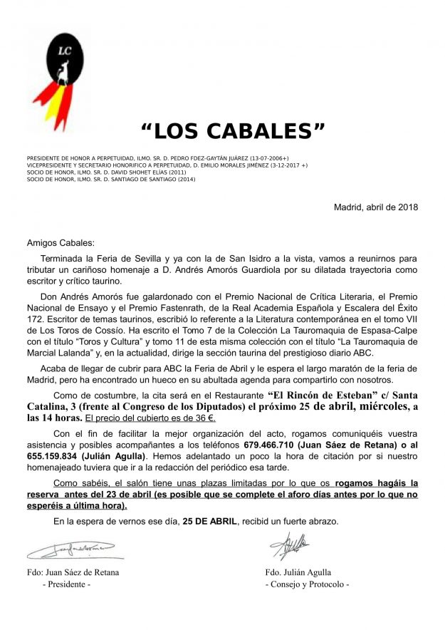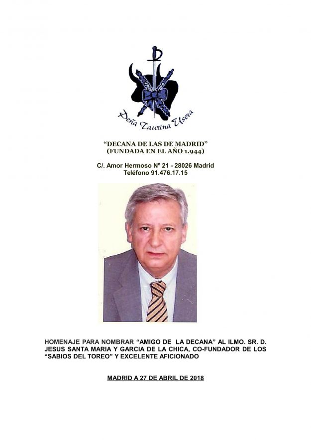 Peña Taurina Usera el homenaje para nombrar «AMIGO DE LA DECANA » al Ilmo. Sr. Don Jesús Santa María y García de La Chica, Co – fundador de Los Sabios del Toreo