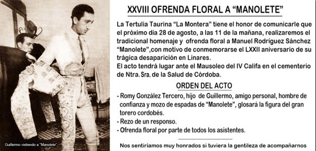 ORGANIZADO POR «LA MONTERA» REUNIÓ EN EL CEMENTERIO A UN AMPLIO GRUPO DE TOREROS, ENTIDADES TAURINAS Y AFICIONADOS Por Ladislao Rodríguez Galán Como viene siendo tradicional desde su fundación en 1991 la Tertulia Taurina «La Montera» cada 28 de agosto organiza un acto de homenaje y ofrenda floral a los pies de la escultura yacente…