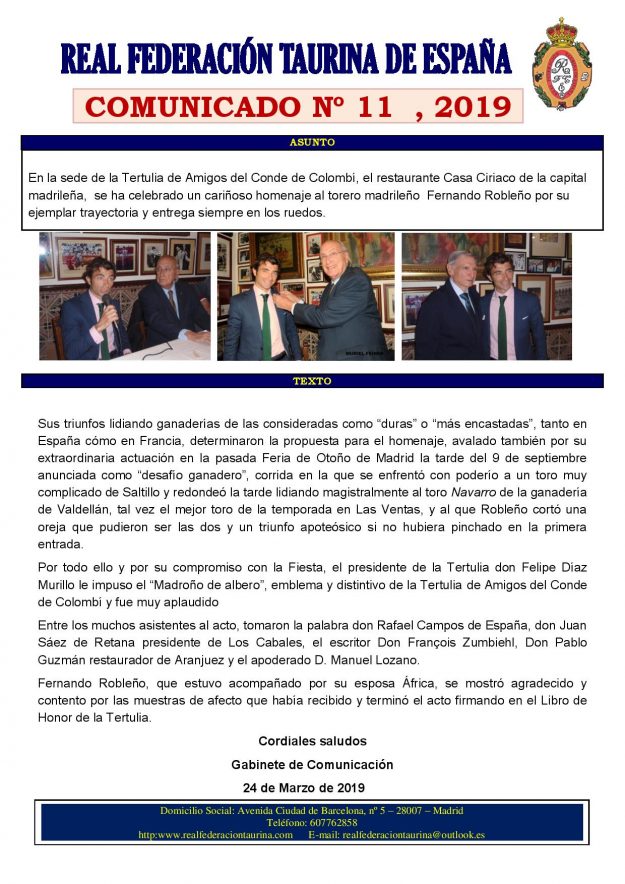 La Peña Taurina «Usera» Decana de las de Madrid, hará la entrega del título “Amigo de la Decana” al JOVEN MATADOR DE TOROS MADRILEÑO nacido en Colmenar de Oreja,“JUAN MIGUEL”, triunfador en varias plazas y entre ellas están Madrid y Valdemorillo.. Tendrá lugar en la Restaurante CIRI, Sede Social de la Peña, C/. Amor Hermoso…