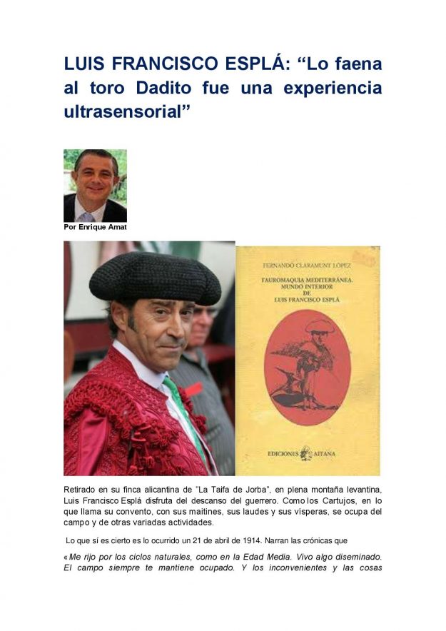 Luis Francisco Esplá: «La faena al toro Dadito fue una experiencia ultrasensorial» – Para + info haz clic👆 🇪🇸 2021, HemerotecaPor Claudia Starchevich2 diciembre, 2021