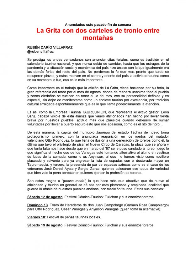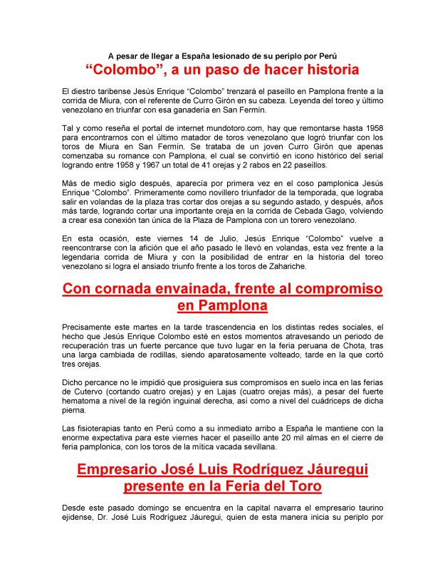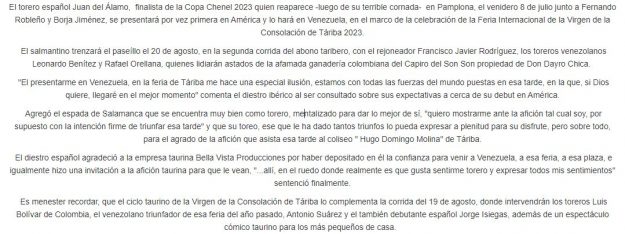 El torero español Juan del Álamo, finalista de la Copa Chenel 2023 quien reaparece -luego de su terrible cornada- en Pamplona, el venidero 8 de julio junto a Fernando Robleño y Borja Jiménez, se presentará por vez primera en América y lo hará en Venezuela, en el marco de la celebración de la Feria Internacional…