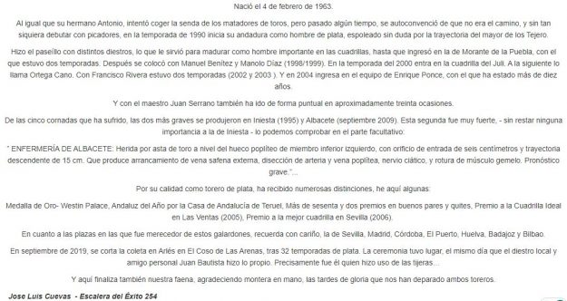 Nació el 4 de febrero de 1963. Al igual que su hermano Antonio, intentó coger la senda de los matadores de toros, pero pasado algún tiempo, se autoconvenció de que no era el camino, y sin tan siquiera debutar con picadores, en la temporada de 1990 inicia su andadura como hombre de plata, espoleado sin duda…