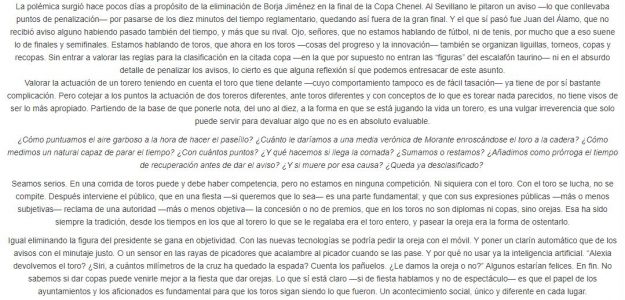 Por: LOPE MORALES La polémica surgió hace pocos días a propósito de la eliminación de Borja Jiménez en la final de la Copa Chenel. Al Sevillano le pitaron un aviso —lo que conllevaba puntos de penalización— por pasarse de los diez minutos del tiempo reglamentario, quedando así fuera de la gran final. Y el que sí pasó fue Juan…