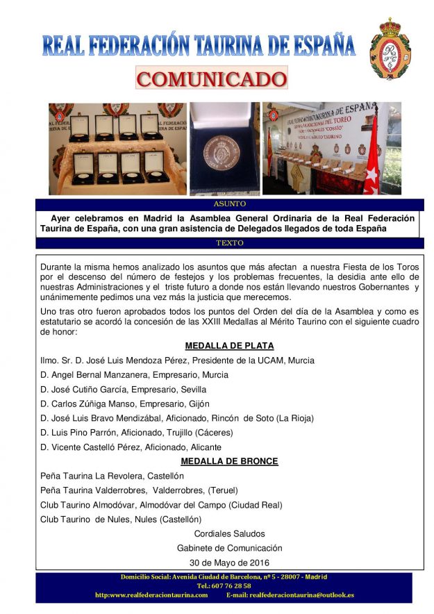 Comunicado en la Ciudad de Castellón 2016, HemerotecaPor Claudia Starchevich2 junio, 2016 Informa Real Federación Taurina de España