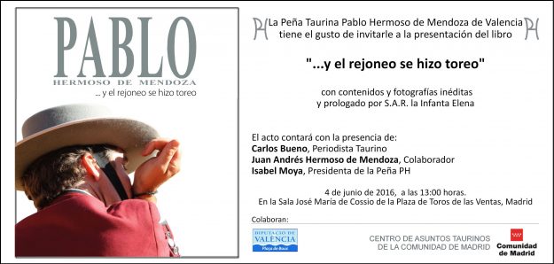 Acto de presentación del libro `Pablo Hermoso de Mendoza… y el rejoneo se hizo toreo´ 2016, HemerotecaPor Claudia Starchevich3 junio, 2016 Informa José Luis Díez