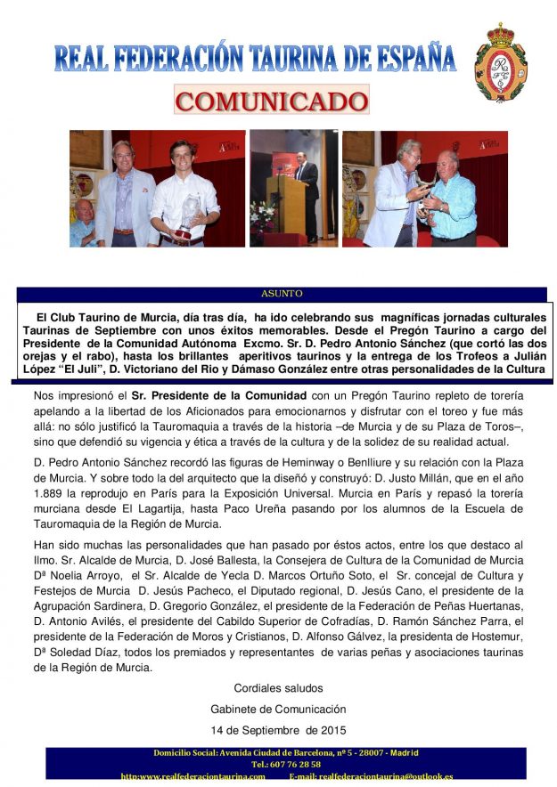 Jornadas culturales en C.T. de Murcia 2015, HemerotecaPor Claudia Starchevich15 septiembre, 2015 Informa Real Federación Taurina de España