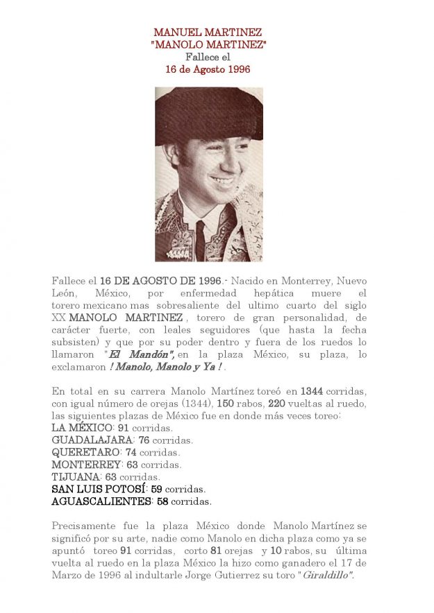Agosto taurino luctuoso (6/7) 2015, HemerotecaPor Claudia Starchevich6 agosto, 2015 Fuente: Lic. Ricardo Zurita.Contoromex