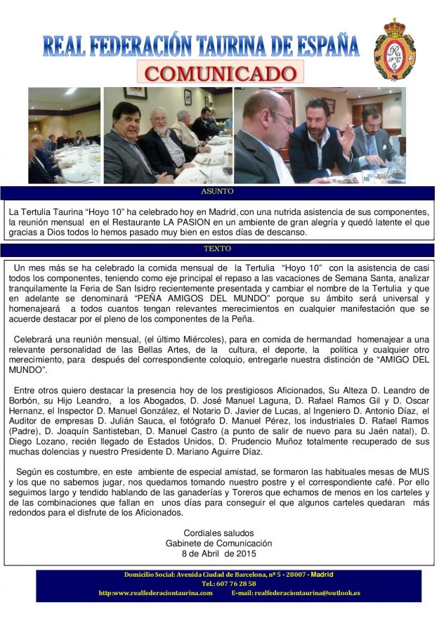 Jornada celebrada en la Peña `Amigos del Mundo´ 2015, HemerotecaPor Claudia Starchevich9 abril, 2015< Informa Real Federación Taurina de España