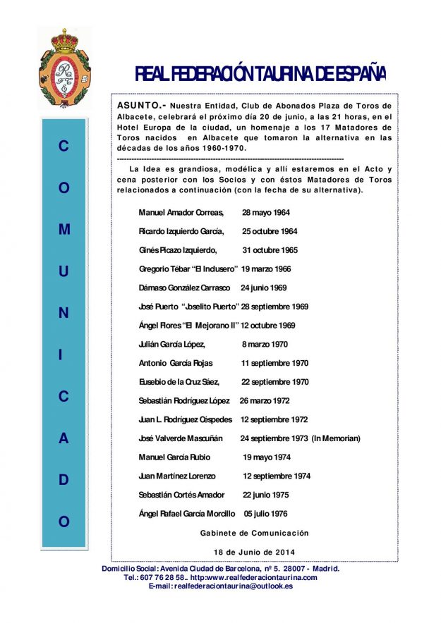 Homenaje a los 17 Matadores de Toros nacidos en Albacete que tomaron la alternativa en las décadas de los años 1960-1970 2014, HemerotecaPor Claudia Starchevich21 junio, 2014 Informa Real Federación Taurina de España