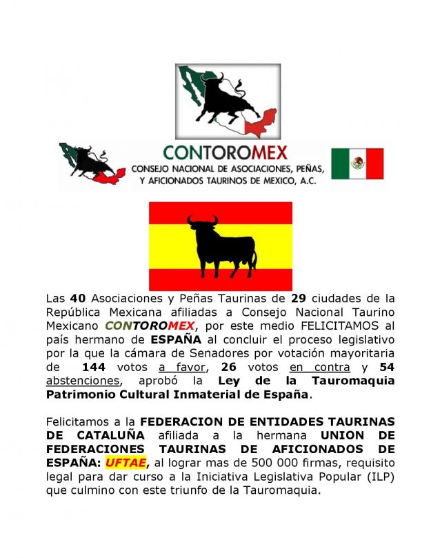 MÉXICO FELICITA A ESPAÑA: Tauromaquia Española Patrimonio Cultural 2013, HemerotecaPor Claudia Starchevich12 noviembre, 2013 Informa Contoromex