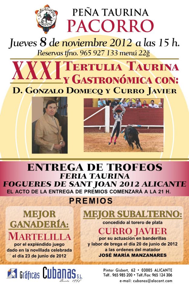Entrega de Premios Peña Taurina Pacorro 2012 2012, HemerotecaPor Claudia Starchevich6 noviembre, 2012 Informa Vicente Sol