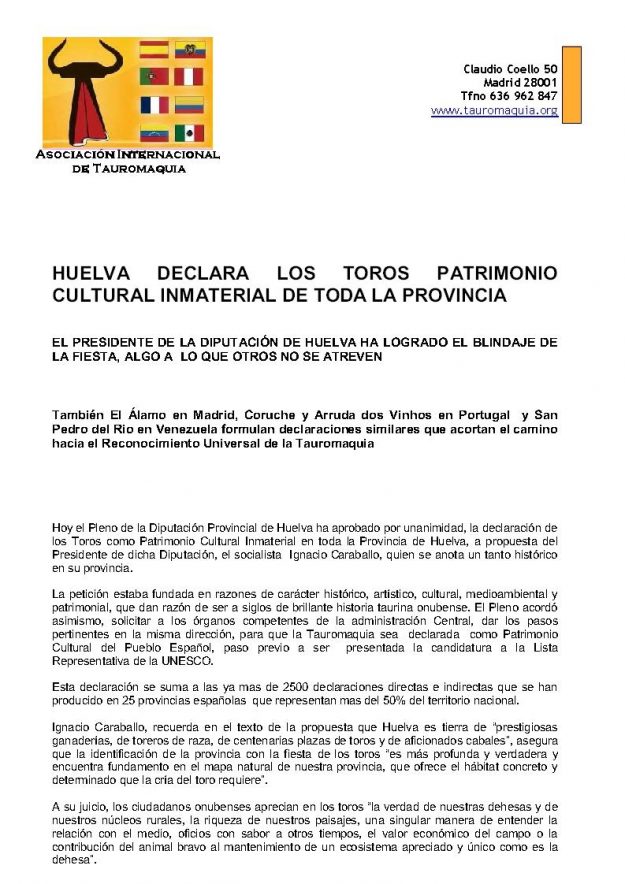 Huelva declara los Toros PCI 2012, HemerotecaPor Claudia Starchevich15 julio, 2012 Informa Asociación Internacional de Tauromaquia