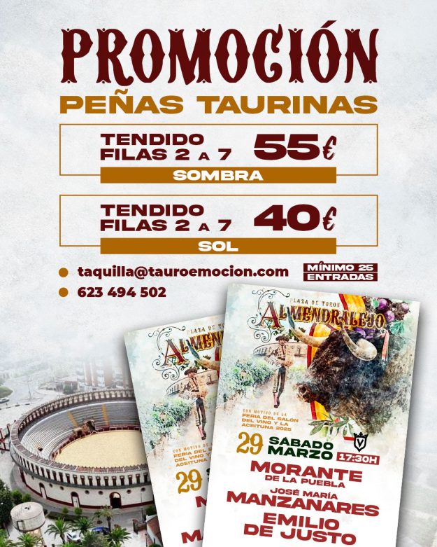 CORRIDA DE TOROS – 29 DE MARZO DE 2025 COSO DE LA PIEDAD DE ALMENDRALEJO (BADAJOZ) TOROS DE JUAN PEDRO DOMECQ MORANTE DE LA PUEBLA JOSÉ MARÍA MANZANARES EMILIO DE JUSTO Desde Tauroemoción, queremos que tengan estás opciones para elegir el precio que mejor se adecúe a sus necesidades. A continuación, describimos los precios…