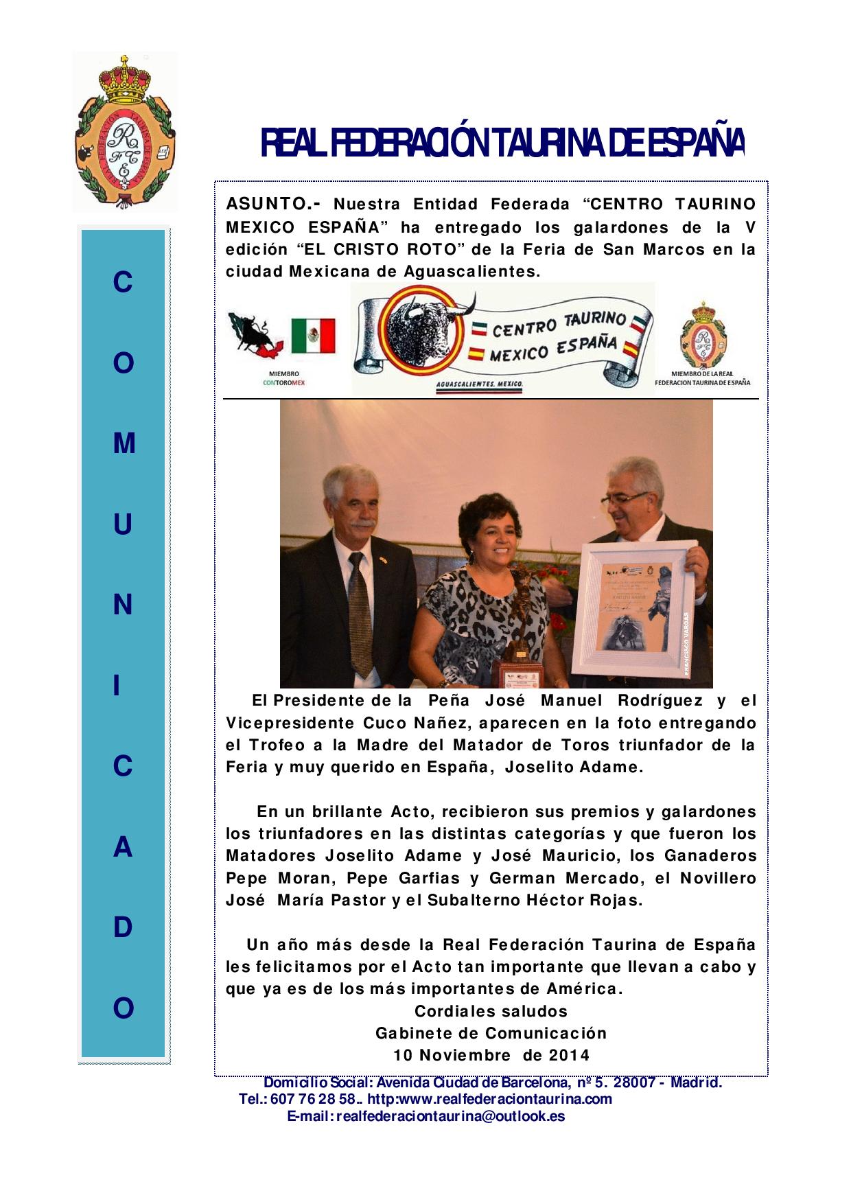 Centro Taurino México España ha entregado los galardones de la V edición `El Cristo Roto´ de la Feria de San Marcos
