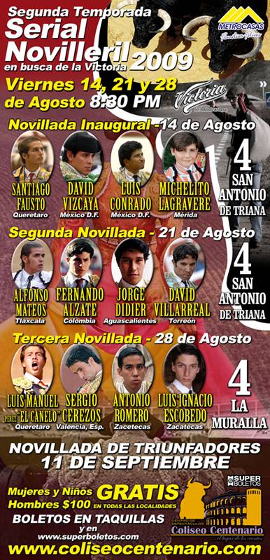 La novillada Inaugural será Mixta ya que actuaran tres novilleros y el niño Torero Michelito Lagravere, quien repite gracias al buen sabor de boca que dejo y que hizo que muchos niños asistieran a todas las novilladas del serial anterior, ya que la promoción de damas y niños gratis hizo que un gran numero de familias asistieran al Coliseo Centenario y con esto se fomento la afición en la comarca Lagunera.
