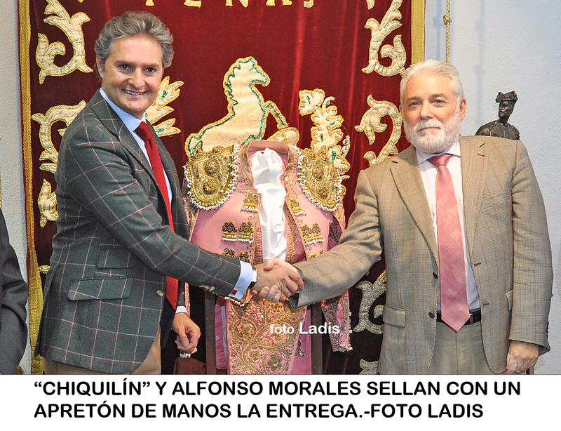 El segundo vestido de torear que usó en su vida taurina el matador de toros Rafael González «Chiquilín», ya luce expuesto en el salón social de la Federación de Peñas Cordobesas gracias a la donación que ha hecho del mismo el propio torero. En las palabras que pronunció en el acto, «Chiquilín» se definió como «un gran admirador de la labor social y de mantenimiento y defensa de las tradiciones populares cordobesas que llevan a cabo las Peñas, y por eso, dijo, uno de mis recuerdos más queridos y que estrené en la Plaza Monumental de Barcelona siendo novillero, lo dono con todo cariño a la Federación para cumplir una promesa que le hice a principios de este año al presidente». Por su parte, Alfonso Morales, presidente de la Federación, se mostró muy agradecido y «consideró un honor contar con este precioso vestío rosa palo y oro que ha pertenecido a uno de los toreros más elegantes que ha dado Córdoba». Asistieron al acto de entrega José Villarrubia, presidente de la peña taurina «Chiquilín» y el vice presidente de la Federación Antonio Arrastio.