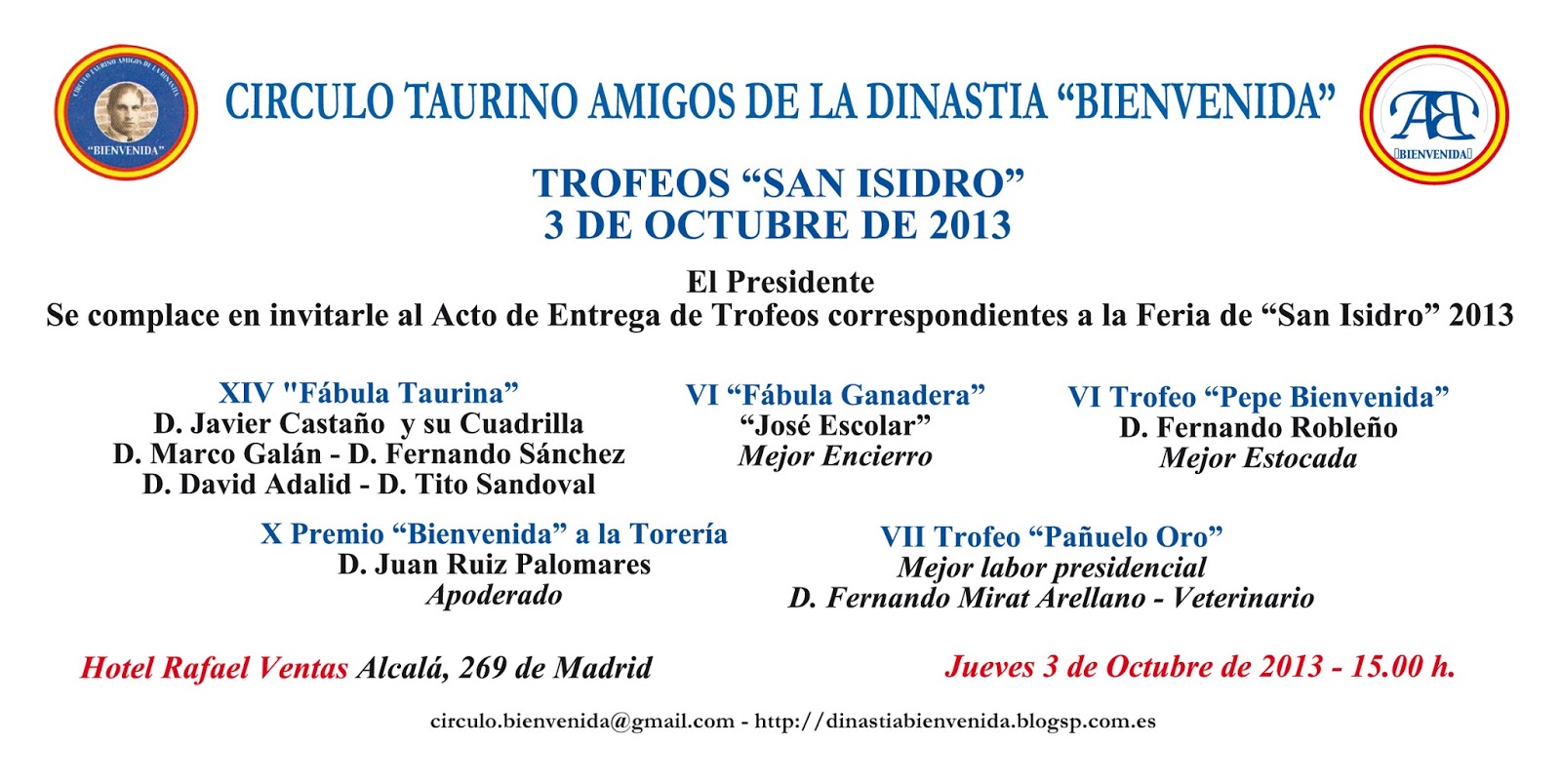 Circulo Bienvenida hará entrega hoy 3 de octubre de los trofeos Feria San Isidro 2013