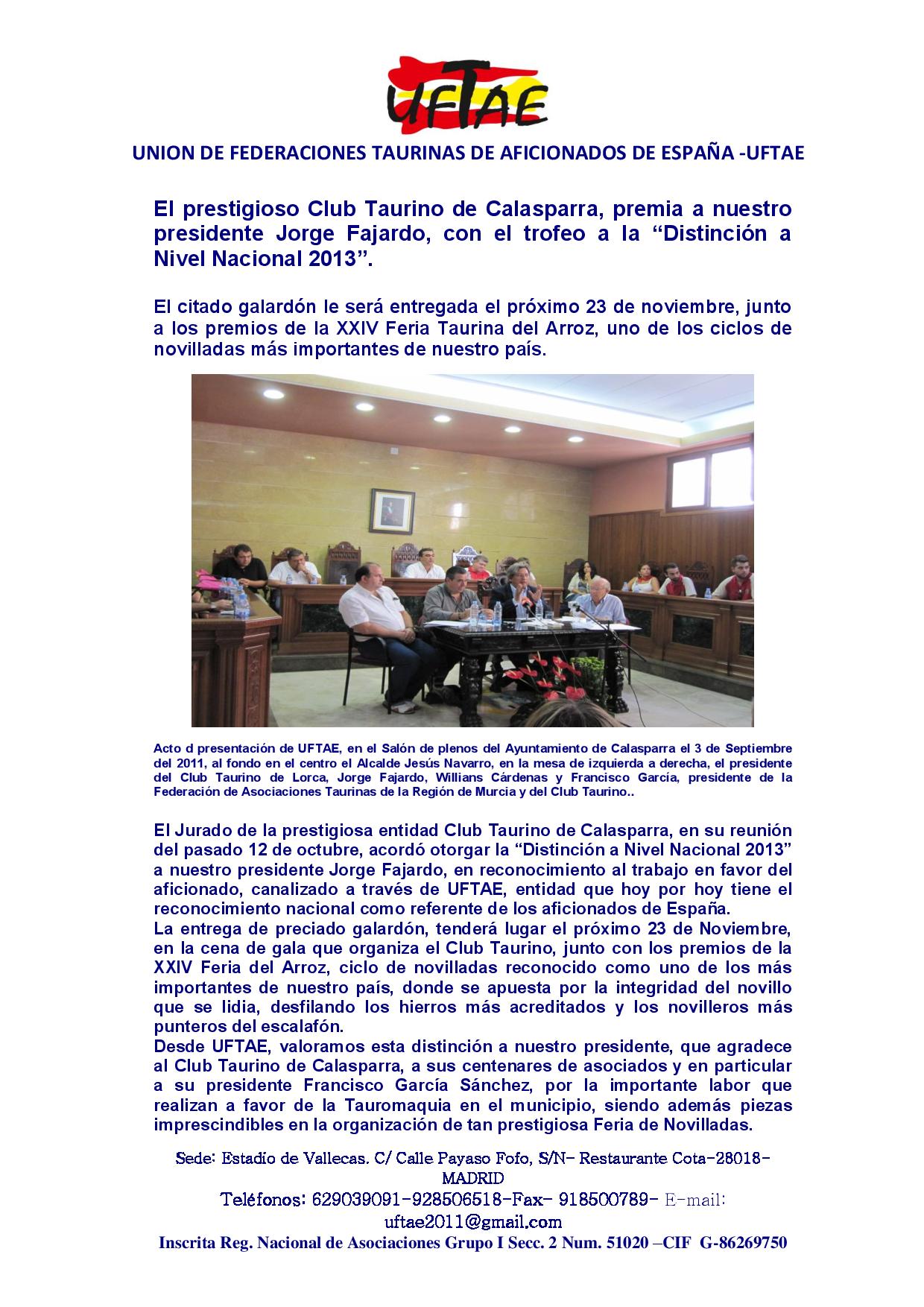 Club Taurino de Calasparra premia a Jorge Fajardo con el trofeo a la Distinción a Nivel Nacional 2013