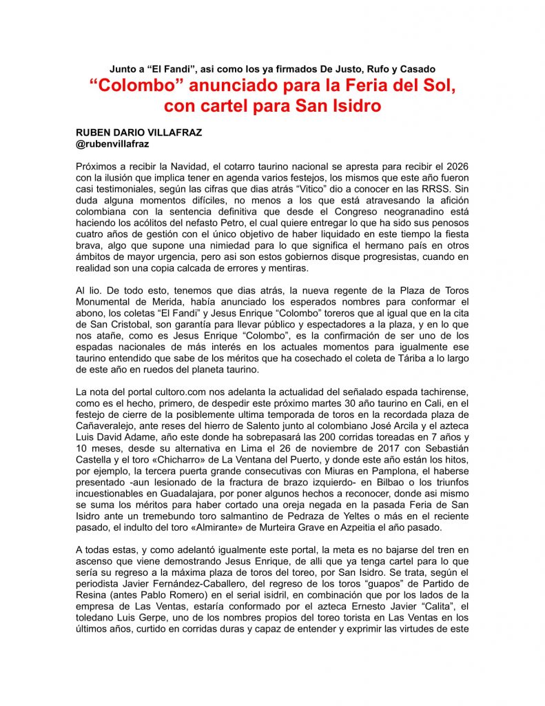 “Colombo” anunciado para la Feria del Sol, con cartel para San Isidro – Para + info haz clic👆 🇪🇸