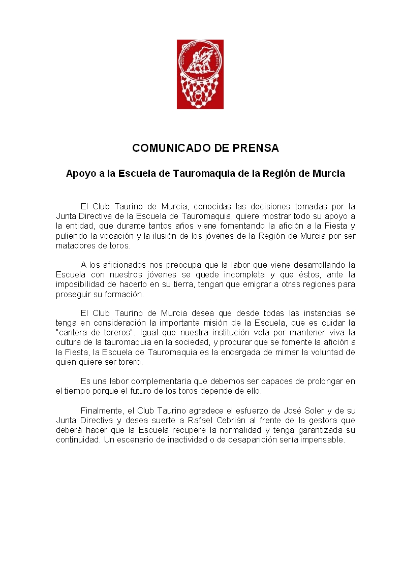 Comunicado Club Taurino de apoyo a la Escuela de Tauromaquia