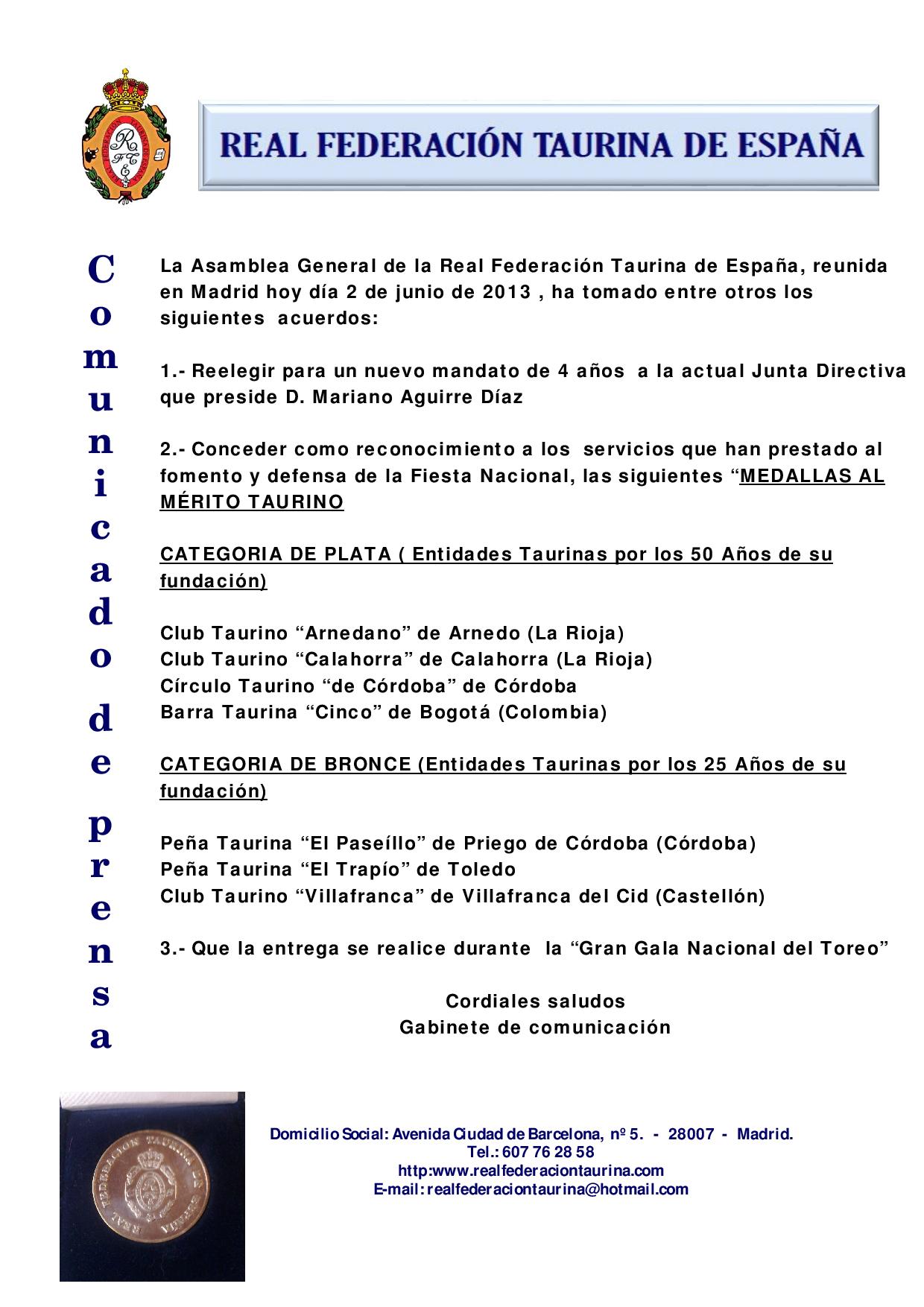 Comunicado con los acuerdos de la Asamblea General de la Real Federación Taurina de España