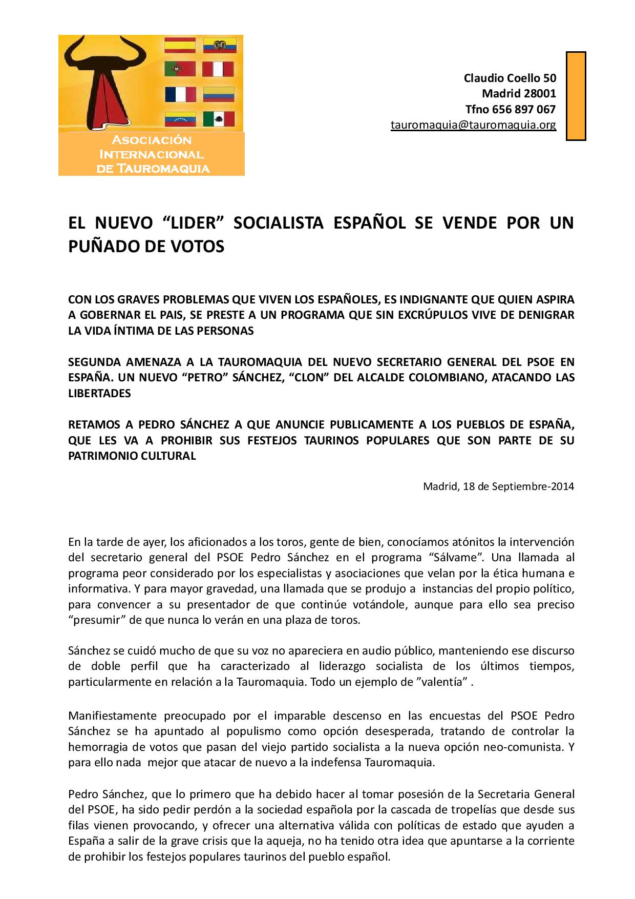 Comunicado de la AIT ante la nueva arremetida del PSOE de Sánchez contra la Tauromaquia