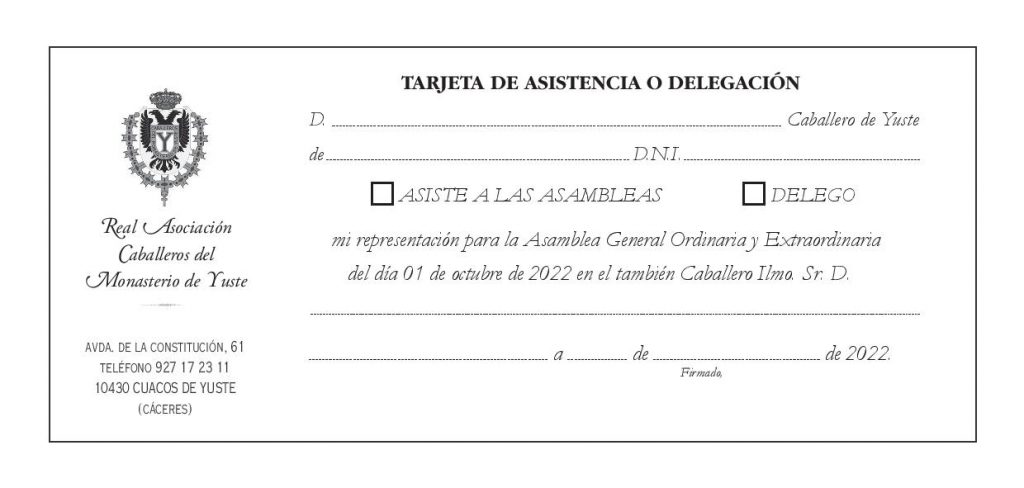 Adjuntamos la tarjeta de delegación, que será acompañada de una fotocopia del D.N.I. de cada Caballero. No tendrá validez ninguna representación que no haya sido enviada con la antelación suficiente, siete días antes de la celebración de las Asambleas, a la oficina administrativa de esta Real Asociación Caballeros del Monasterio de Yuste.