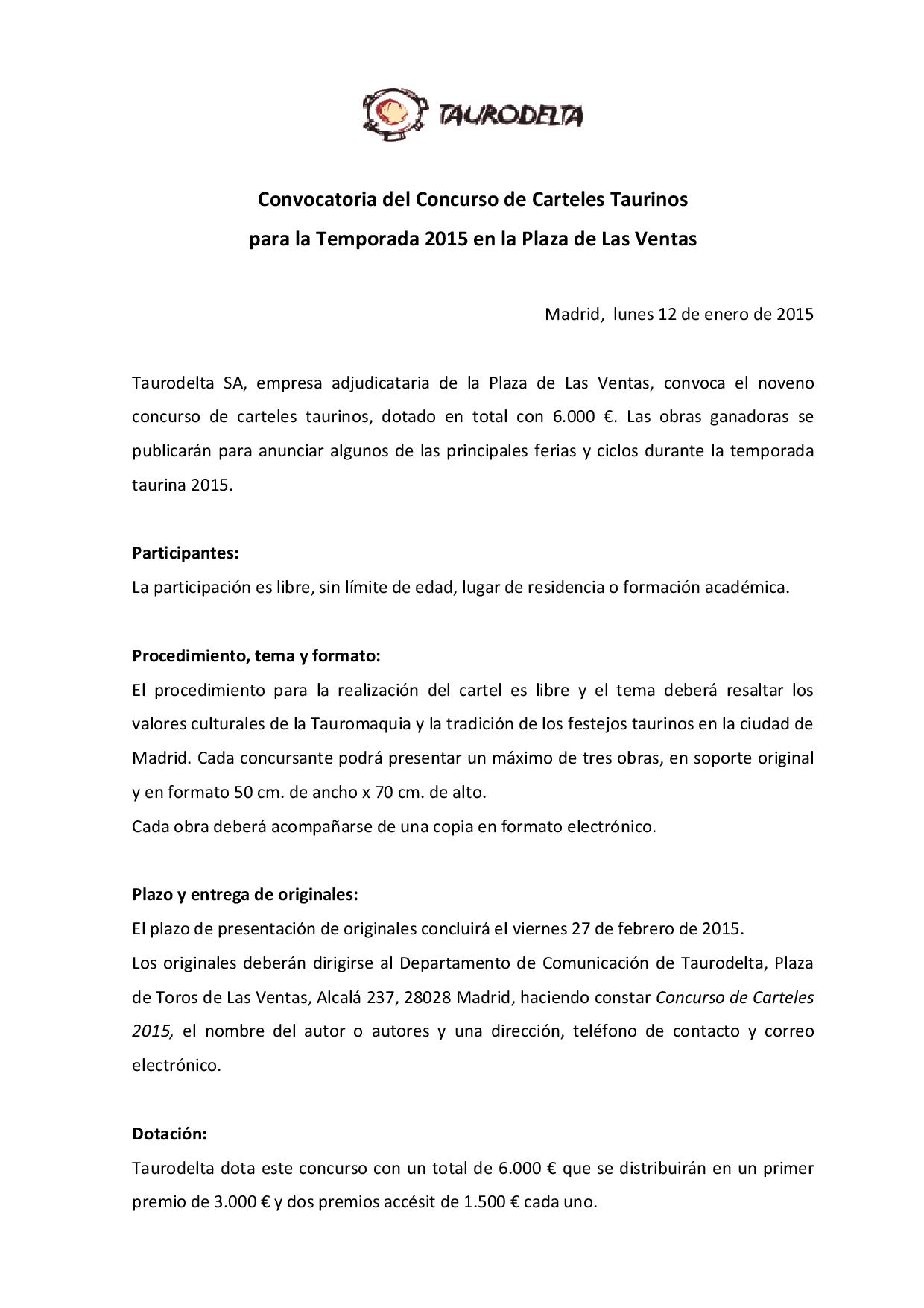 Convocatoria del Concurso de Carteles Taurinos para la Temporada 2015 en la Plaza de Las Ventas