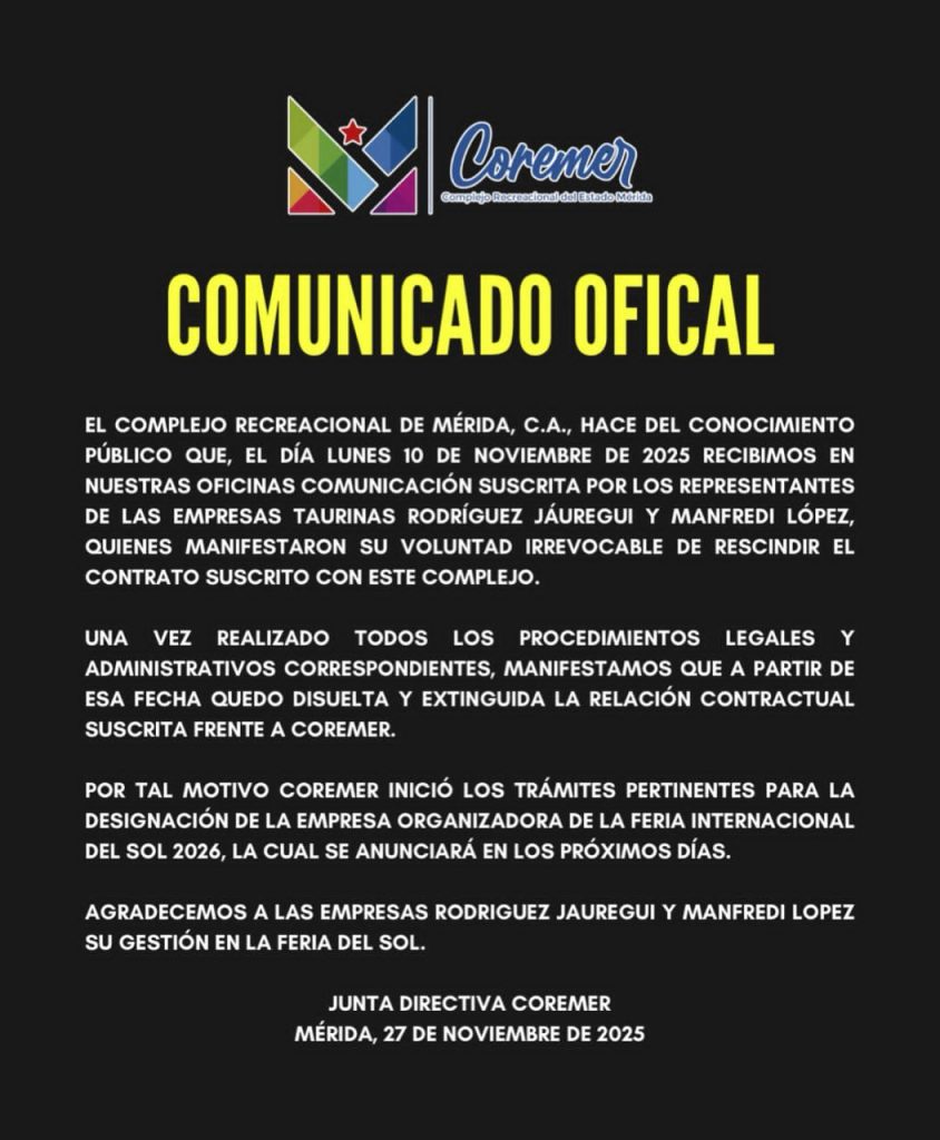 El Complejo Recreacional del Estado Mérida (Coremer) emitió este jueves un comunicado oficial en el que informa la culminación de su relación contractual con las empresas taurinas Rodríguez Jáuregui y Manfredi López, responsables de la organización de la Feria Internacional del Sol en sus últimas ediciones.