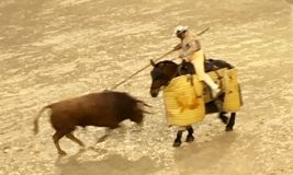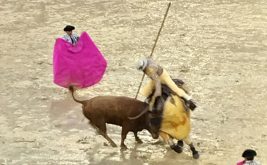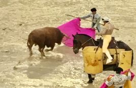 Los dos puyazos de Alberto Sandoval al 1º fueron: muy trasero su 1º, trasero el 2º. Y siempre la innecesaria presencia del banderillero que nos impide valorar la bravura del toro, en este caso era César Fernández. Cuando un toro no ha rehuido el encuentro no es conveniente que alguien esté cerca del caballo porque impedirá que el toro se exprese ante él sin alicientes externos.