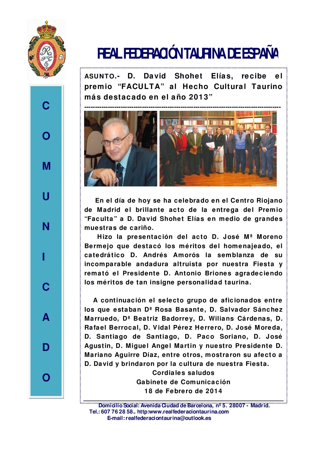 D. David Shohet Elías (Escalera del Éxito 116), recibe el premio “FACULTA” al Hecho Cultural Taurino más destacado en el año 2013”