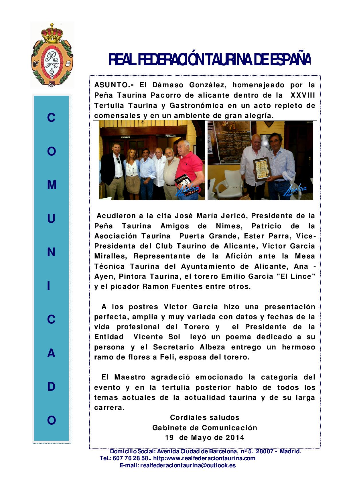 Dámaso González (Escalera del Éxito 40) homenajeado por la Peña Taurina Pacorro