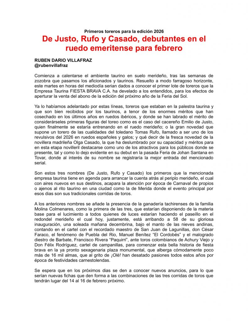 De Justo, Rufo y Casado, debutantes en el ruedo emeritense para febrero – Para + info haz clic👆 🇪🇸