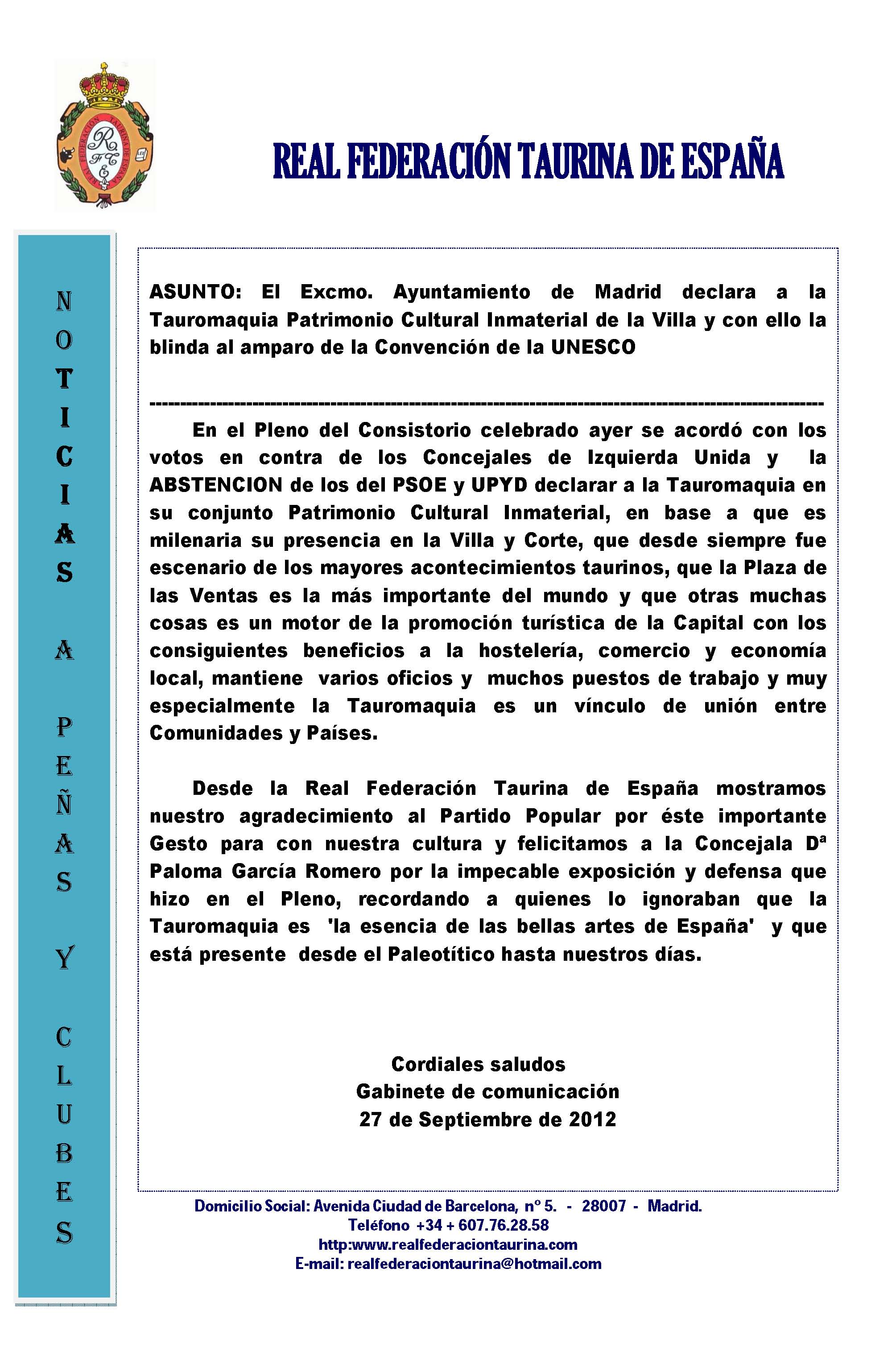 Declaración de la Fiesta de los Toros como Patrimonio Cultural Inmaterial de la Ciudad de Madrid