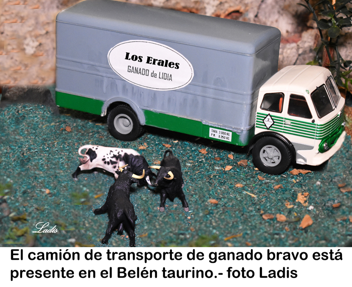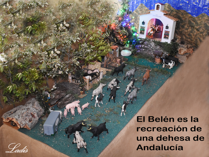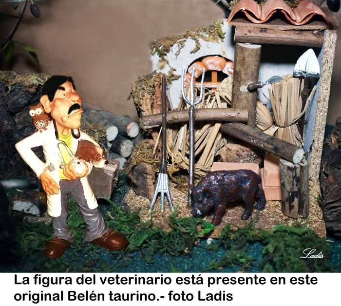 Por esa innovación, sin faltar el respeto, nos ha agradado muchísimo el Belén que ha montado en su casa para disfrute de sus nietos, nuestro entrañable amigo José Luis Prieto, veterinario experto en el toro bravo. Es una idea muy original. Ha recreado una dehesa andaluza con un corredero donde caminan los toros hacia el portal. No faltan los caballos, los perros, algunos jabalís e incluso el camión de los toros aparcado a la vera esperando para cargar. Y fíjense si es detallista que no ha olvidado la figura del veterinario. Donde hay animales siempre hay un veterinario y aquí no podía faltar.
