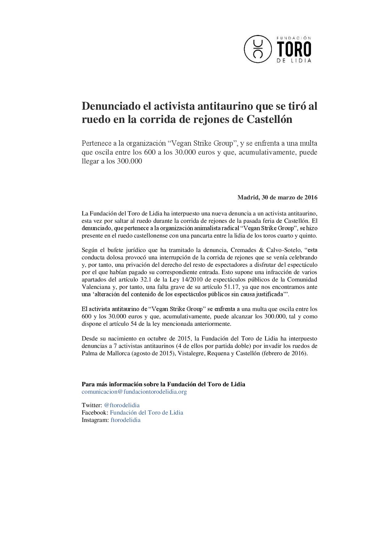 Denunciado el activista antitaurino que se tiró al ruedo en la corrida de rejones de Castellón