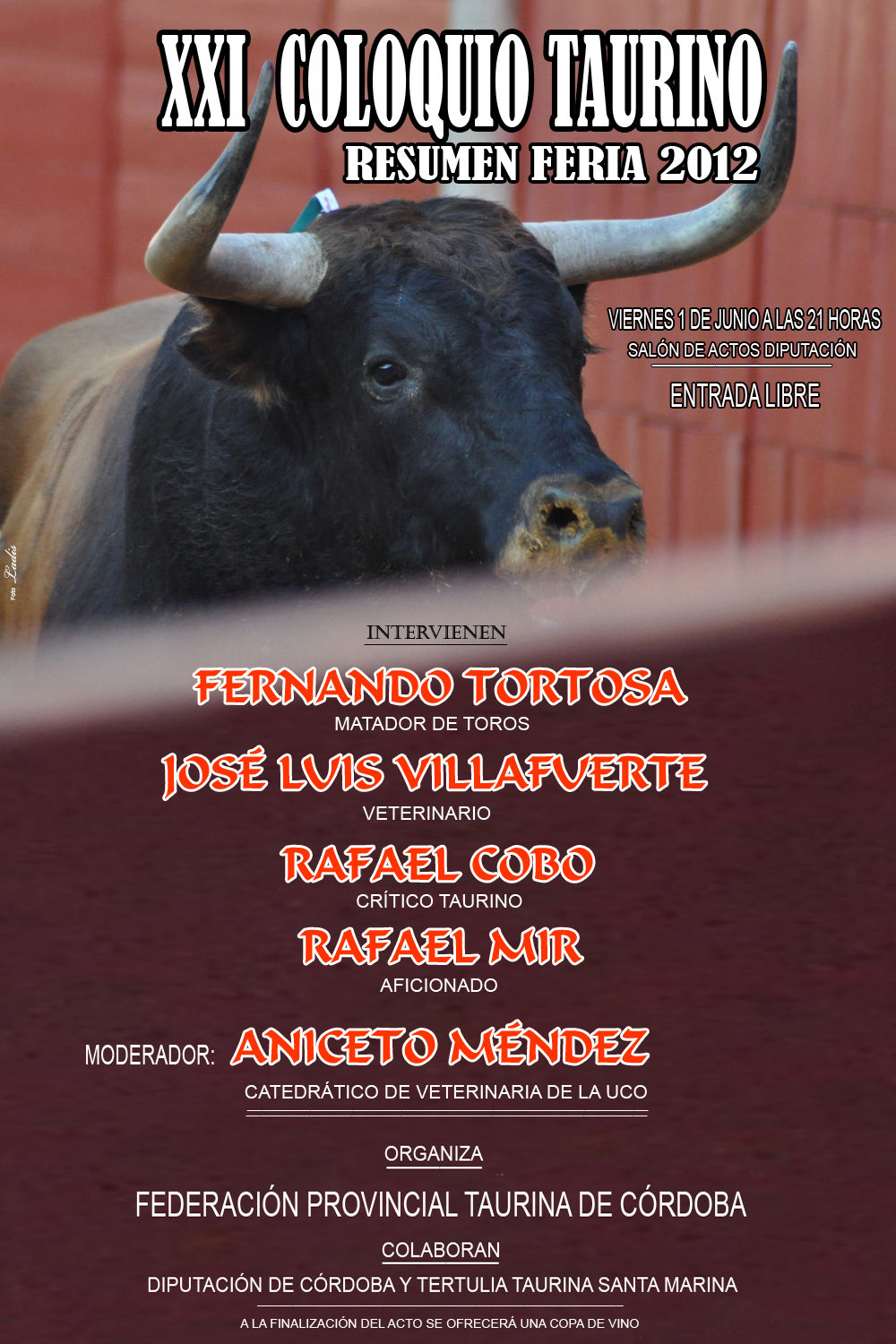 La Federación Provincial Taurina de Córdoba ha ultimado el cartel de aficionados que debatirán sobre lo acontecido en la feria taurina 2012, en el XXI Coloquio Taurino que este año, por circunstancias específicas, organiza la Federación en vez de la Tertulia Taurina Santa Marina que lo viene haciendo desde su inicio.