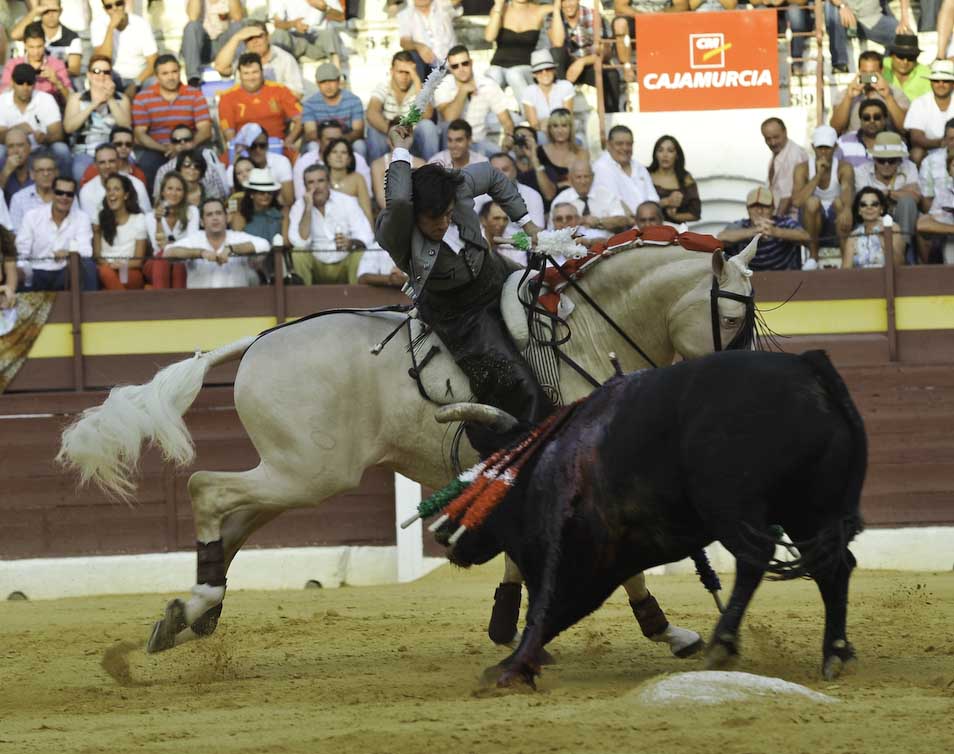 Comenzó con Nazarí galopando de costado pero el de Bohórquez no seguía lo suficiente. Aun así logró encelarlo y clavó dos palos con mucha verdad, el segundo de ellos citando de punta a punta de