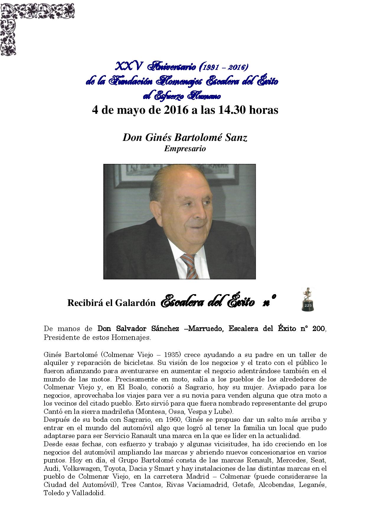 Don Ginés Bartolomé Sanz recibirá la Escalera del Éxito nº 225 el próximo 4 de mayo