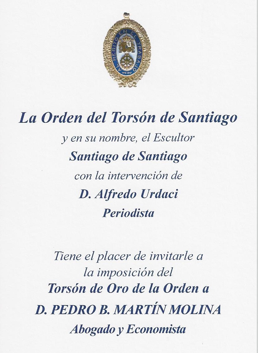 El acto se celebrará 25 de Noviembre de 2015, a las 19.30 horas en el Museo del Escultor. En nombre del Escultor Santiago de Santiago (Escalera del Éxito 92),  con la intervención de Don Alfredo Urdaci, Periodista, procederán a la imposición del Torsón de Oro de la Orden a Don Pedro B. Martín Molina, Abogado y Economista.