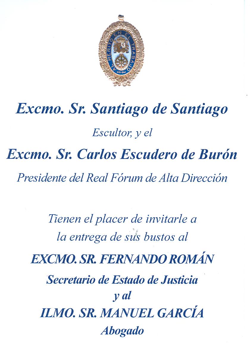 El acto se celebrará el 15 de septiembre de 2014, a las 19,30 horas en el Museo del Escultor. En nombre del Escultor Santiago de Santiago (Escalera del Éxito 92), con la intervención del Excmo. Sr. Don Carlos Escudero de Burón, Presidente del Real Forum de Alta Dirección, procederán a la entrega de bustos al Excmo. Sr. Don Fernando Román, Secretario de Estado de Justicia y al Ilmo. Sr. Don Manuel García, abogado.