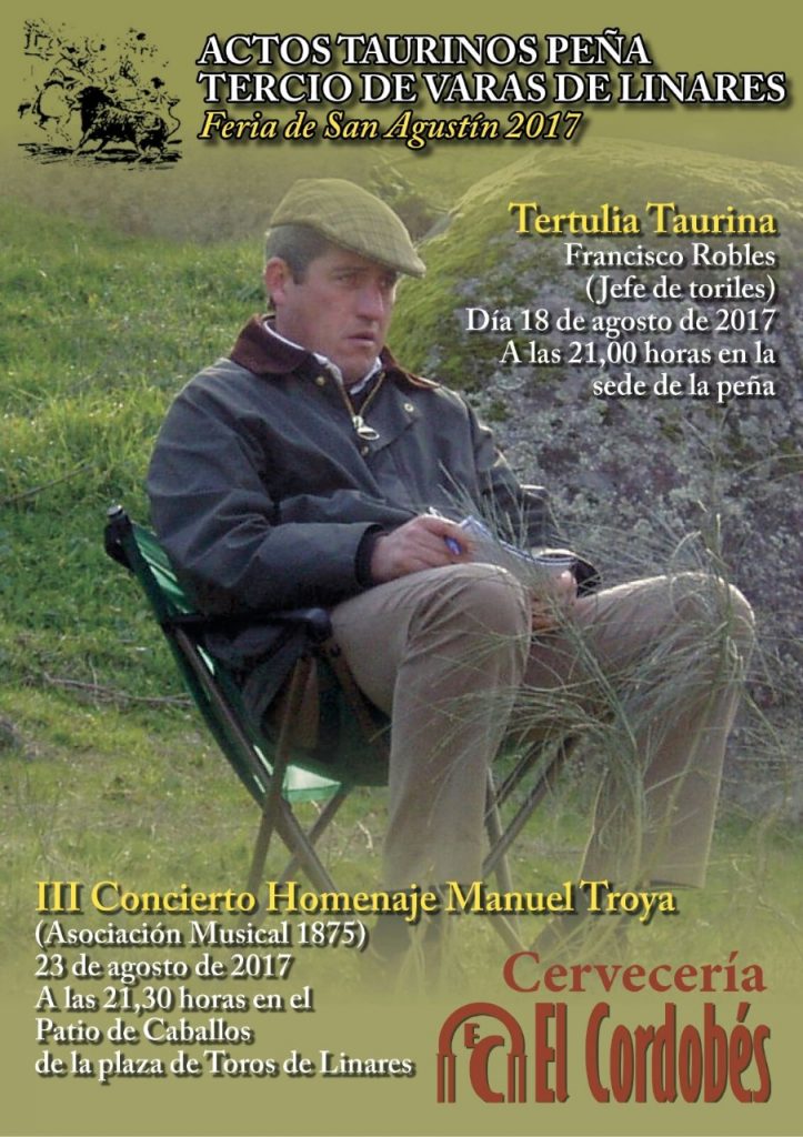 La peña taurina Tercio de Varas organiza dos actos taurinos durante la feria de San Agustín de Linares. El primero se trata de una tertulia en la que estará como invitado Francisco Robles, jefe de toriles de la plaza de toros de esta ciudad, y, la segunda, un concierto de pasodobles en memoria de Manuel Troya a cargo de la Agrupación Musical 1875 de Linares.