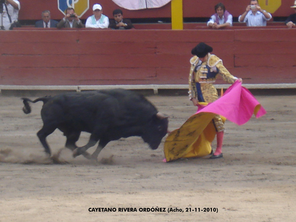 Cayetano Rivera Ordóñez con un terno azul y oro, nuevo en ésta plaza, al que Lima esperó su llegada, algunos destellos con el percal. Lamentablemente nada grande que reseñar con la muleta, que el público se empezó a desesperar y su faena fue silenciada. El sexto toro diferente de pelo que sus hermanos pero igual de descastado, sirvió un poco más por oleadas, ya que llegó buscando el abrigo de la tablas y se defendió, pero Cayetano vio que podía aprovechar esos pocos momentos de embestida e hizo una labor variada sin ligar series, sólo muletazos efectistas que llegan a los tendidos provocando el delirio del público de sol que tras pinchar dejó una estocada hasta los gavilanes. El público sacó los pañuelos blancos y generosamente el presidente de plaza le concedió las dos orejas.