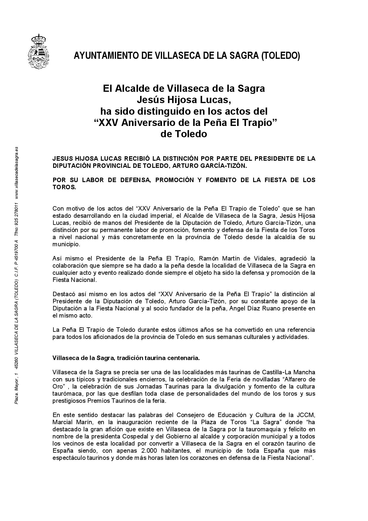 El Alcalde de Villaseca de la Sagra Jesús Hijosa Lucas, ha sido distinguido en los actos del XXV Aniversario de la Peña El Trapío de Toledo